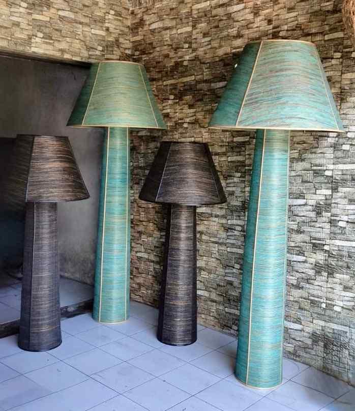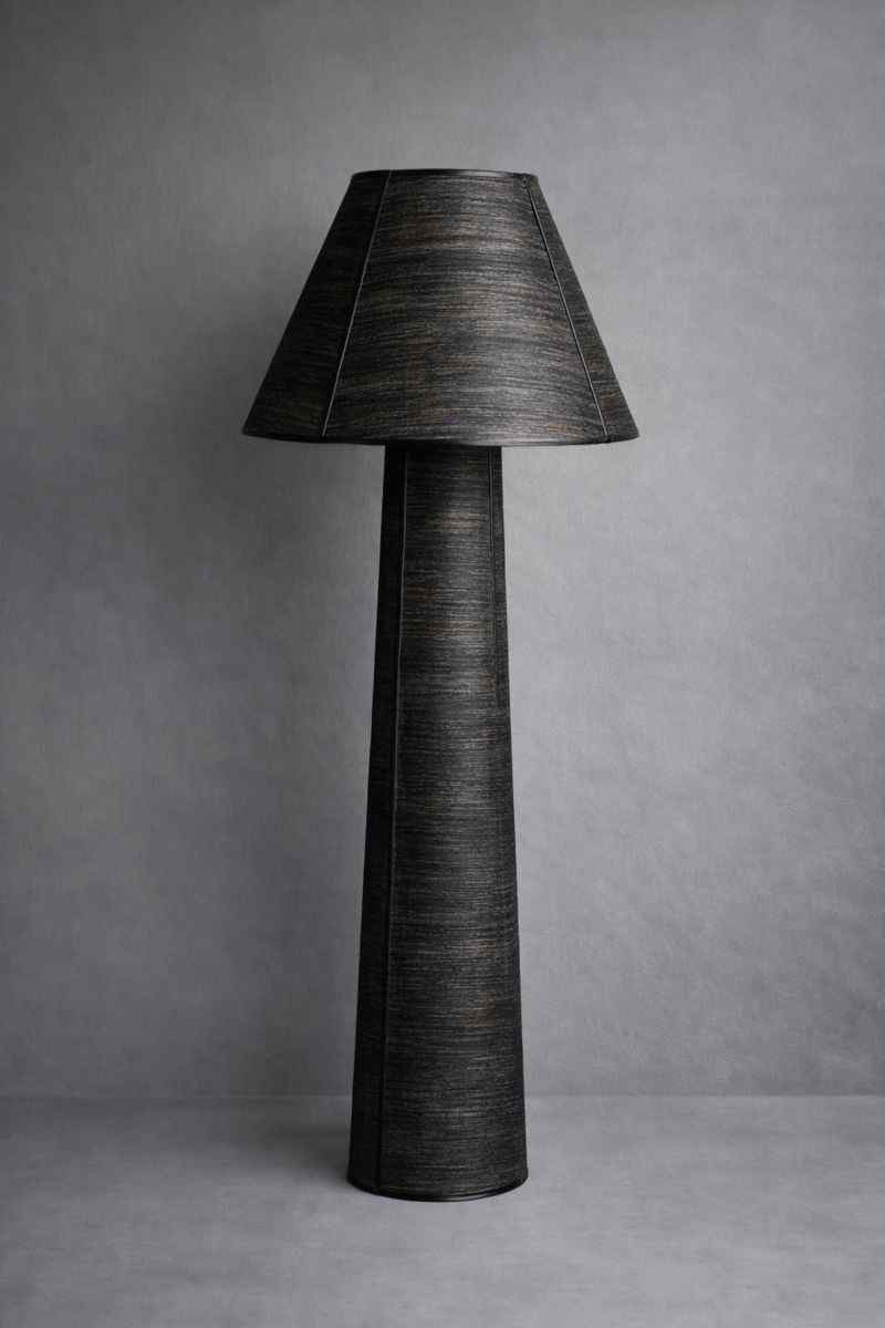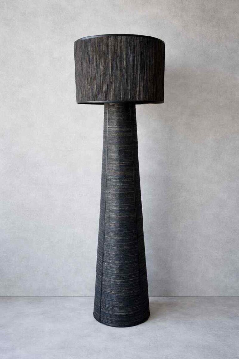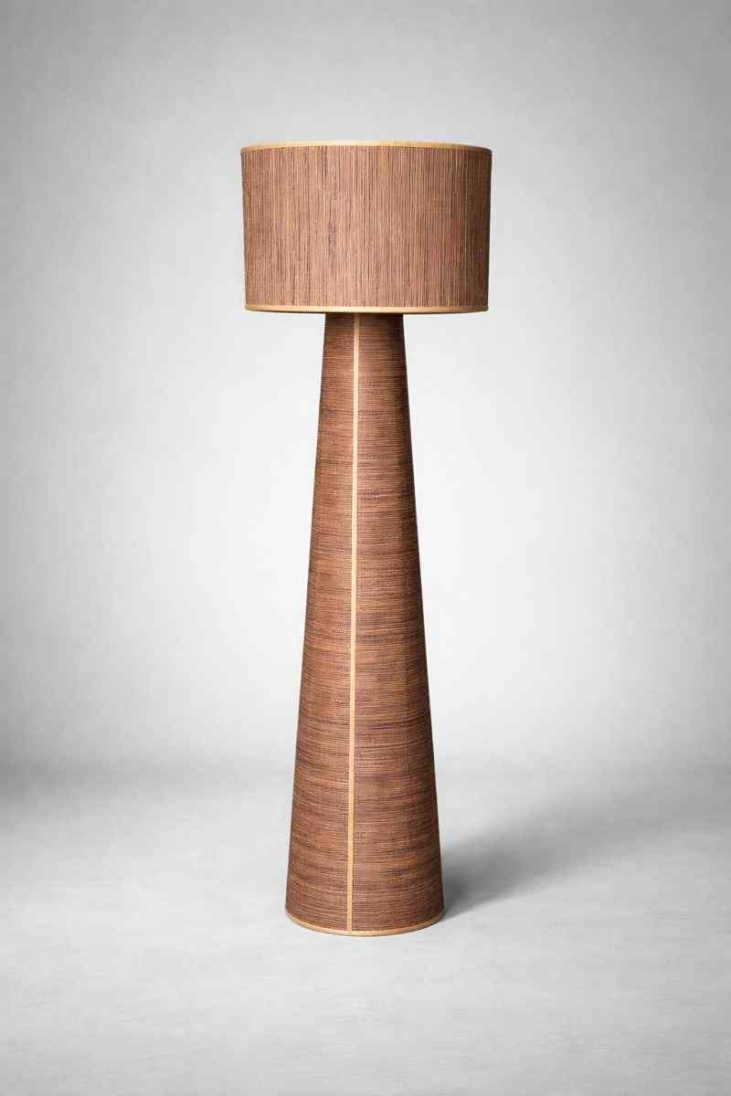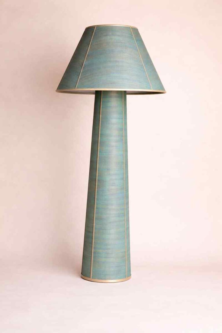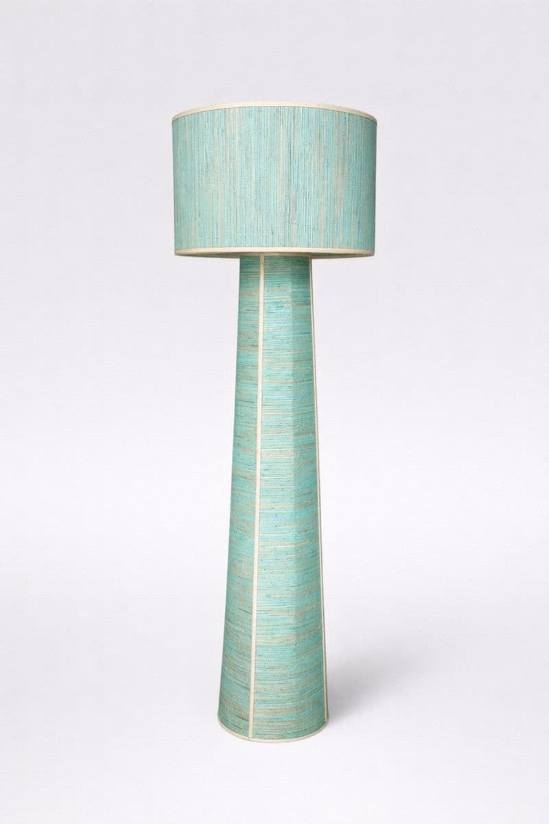 Lampa podłogowa wykonana ręcznie z naturalnego hiacyntu wodnego, z wysoką, smukłą podstawą i stożkowym lub cylindrycznym abażurem w barwionym odcieniu.