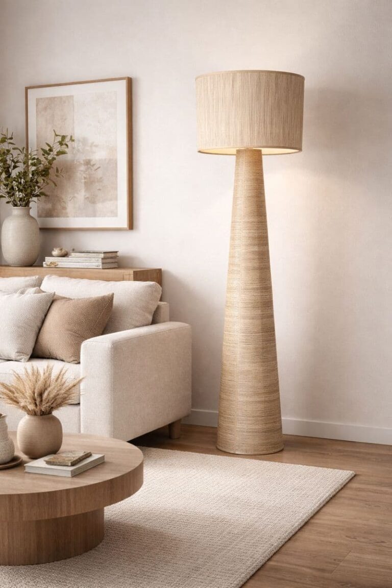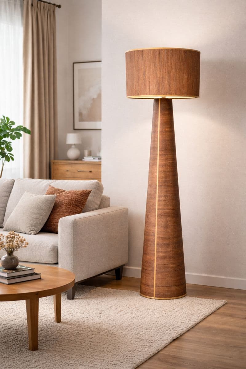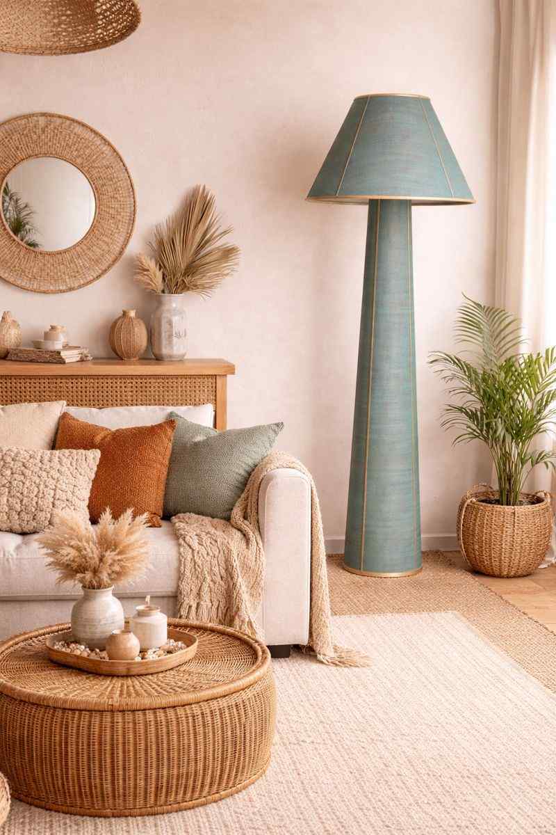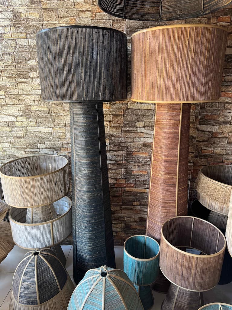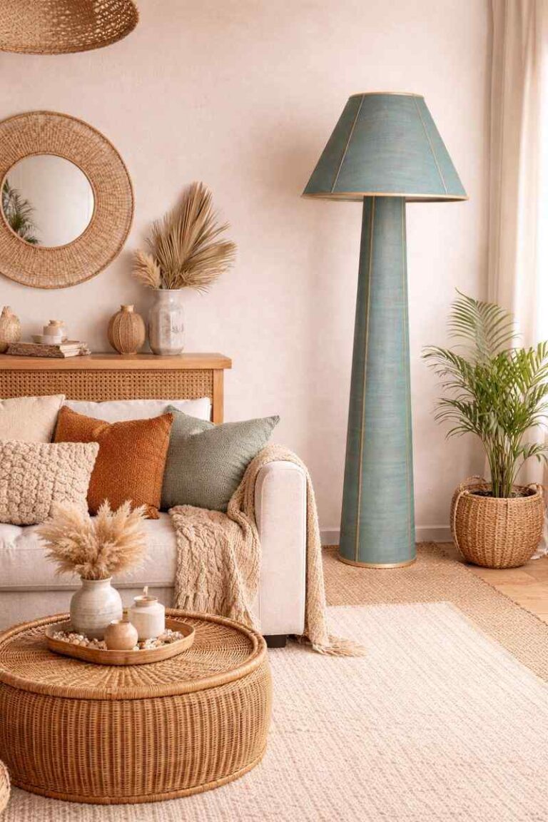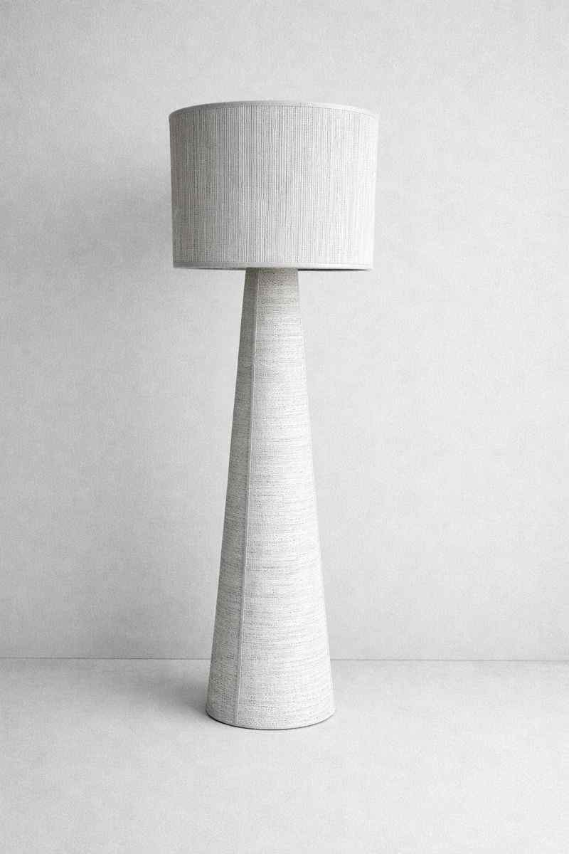 Lampa podłogowa wykonana ręcznie z naturalnego hiacyntu wodnego, z wysoką, smukłą podstawą i stożkowym lub cylindrycznym abażurem w barwionym odcieniu.