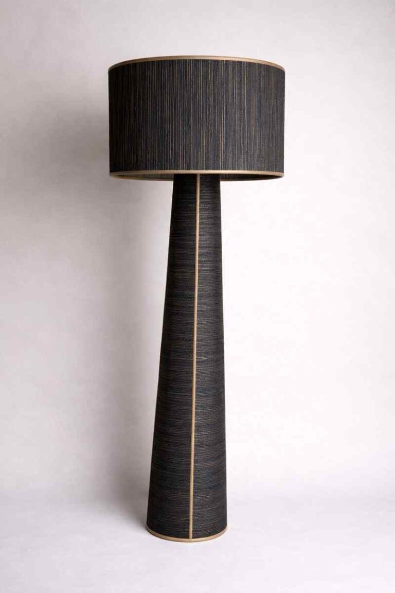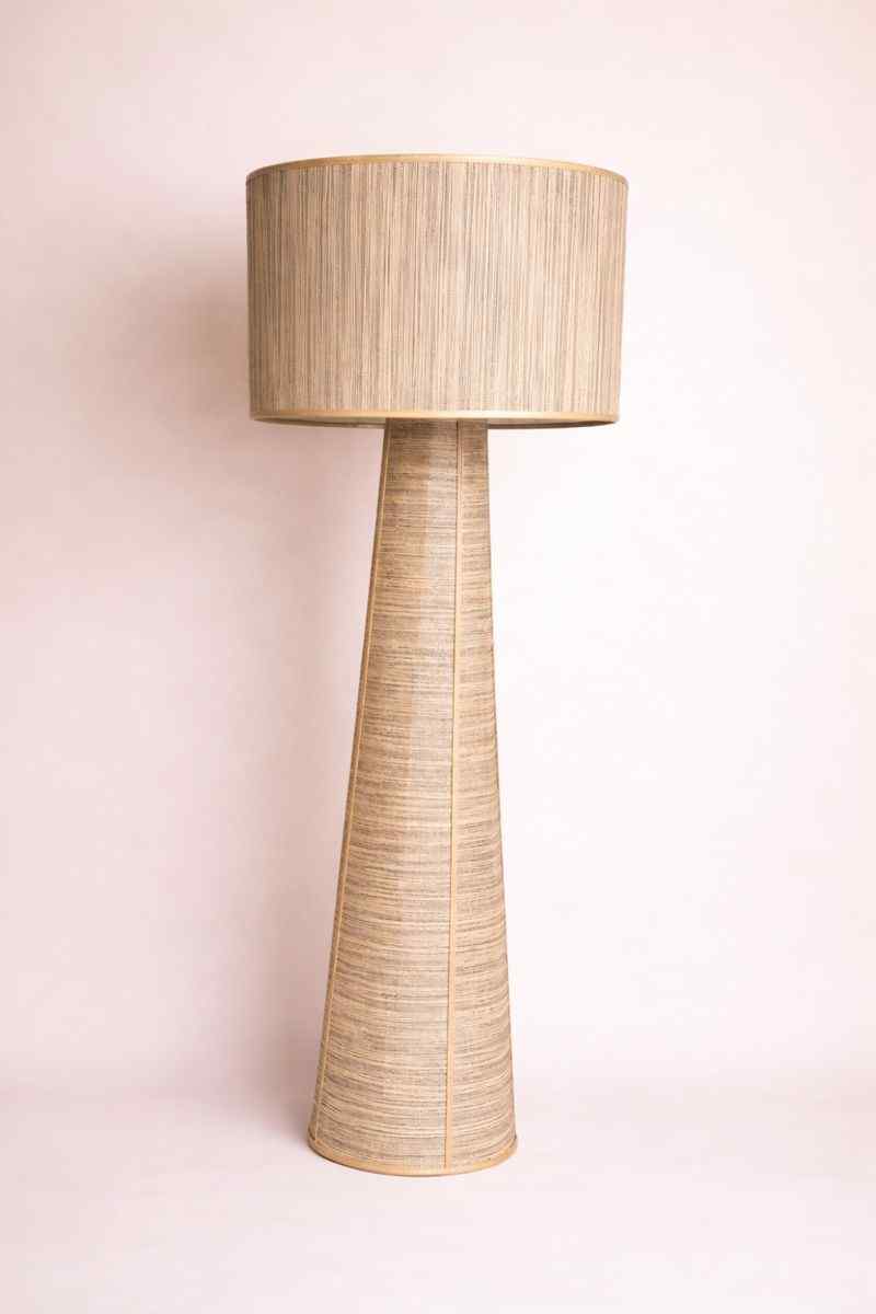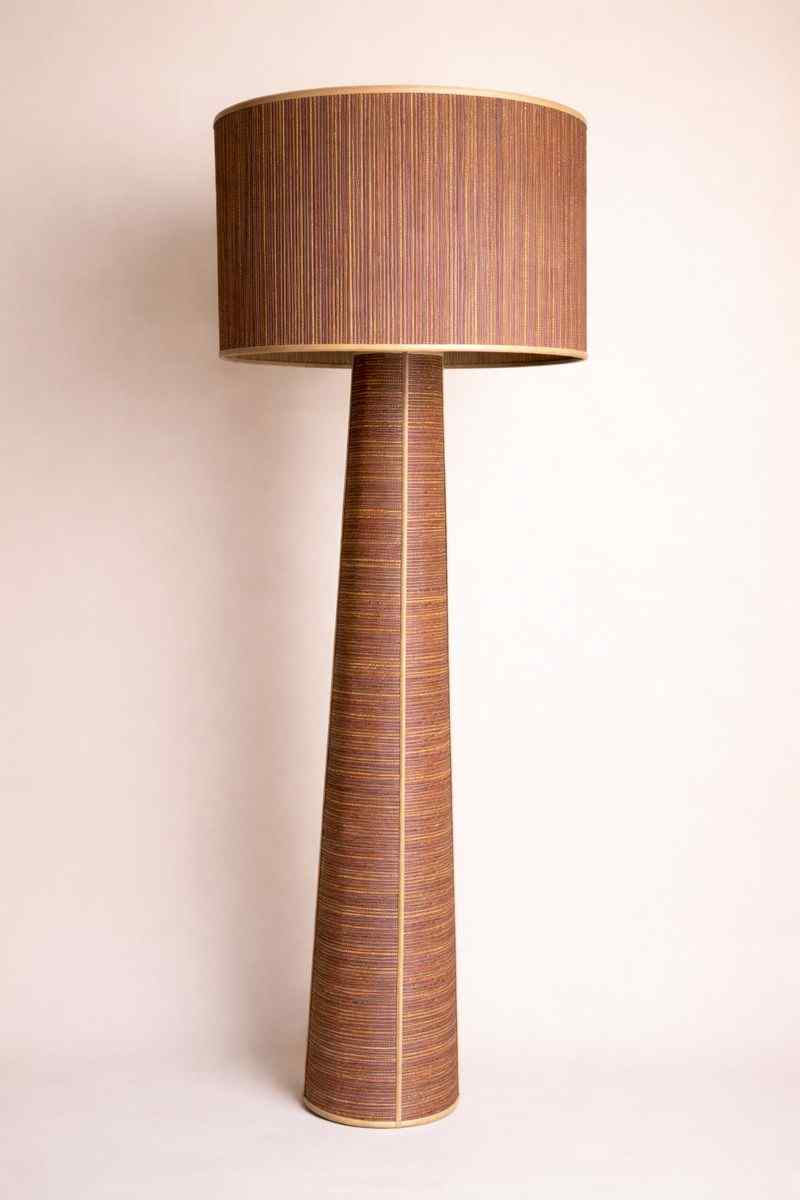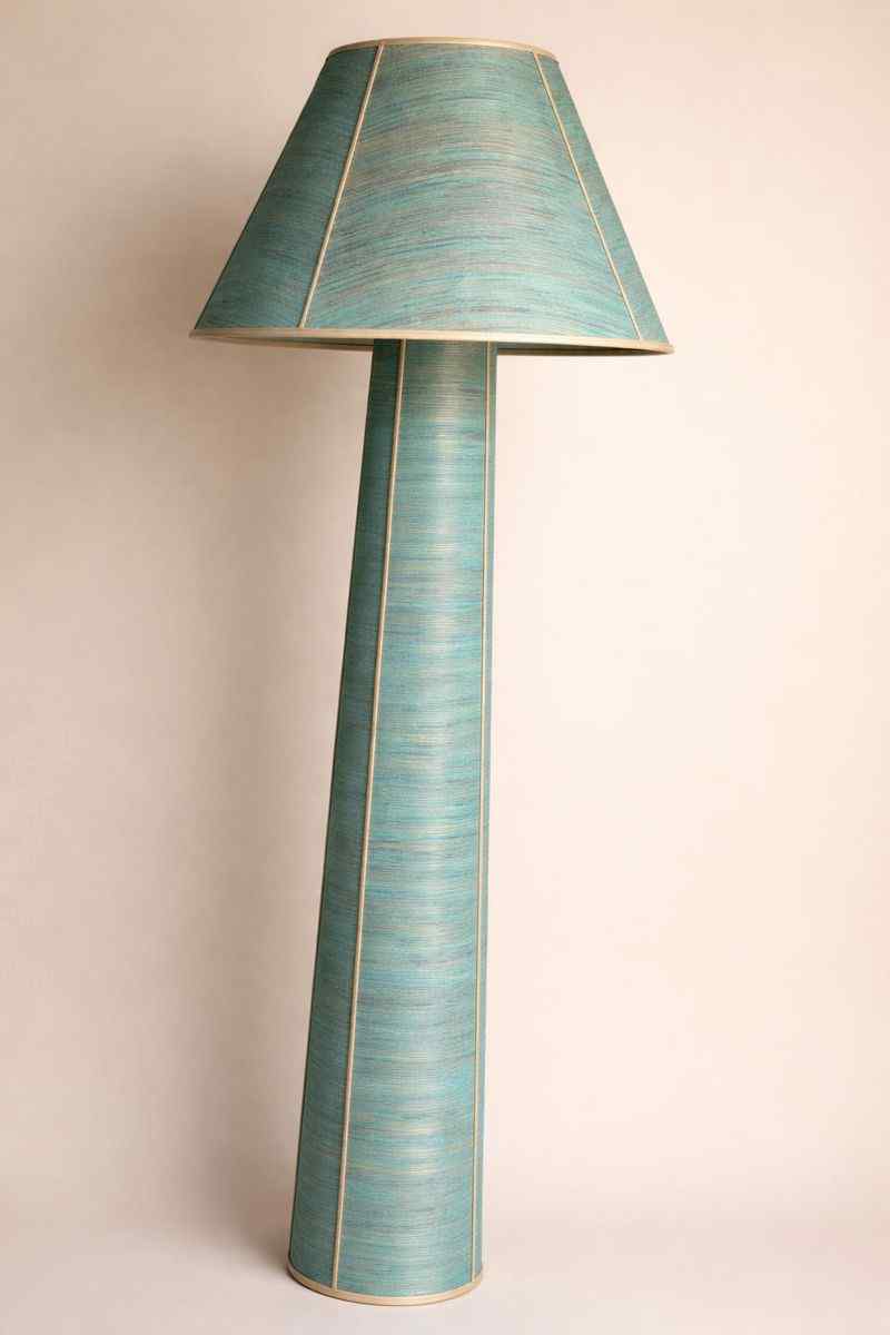 Lampa podłogowa wykonana ręcznie z naturalnego hiacyntu wodnego, z wysoką, smukłą podstawą i stożkowym lub cylindrycznym abażurem w barwionym odcieniu.