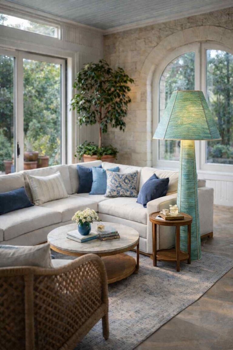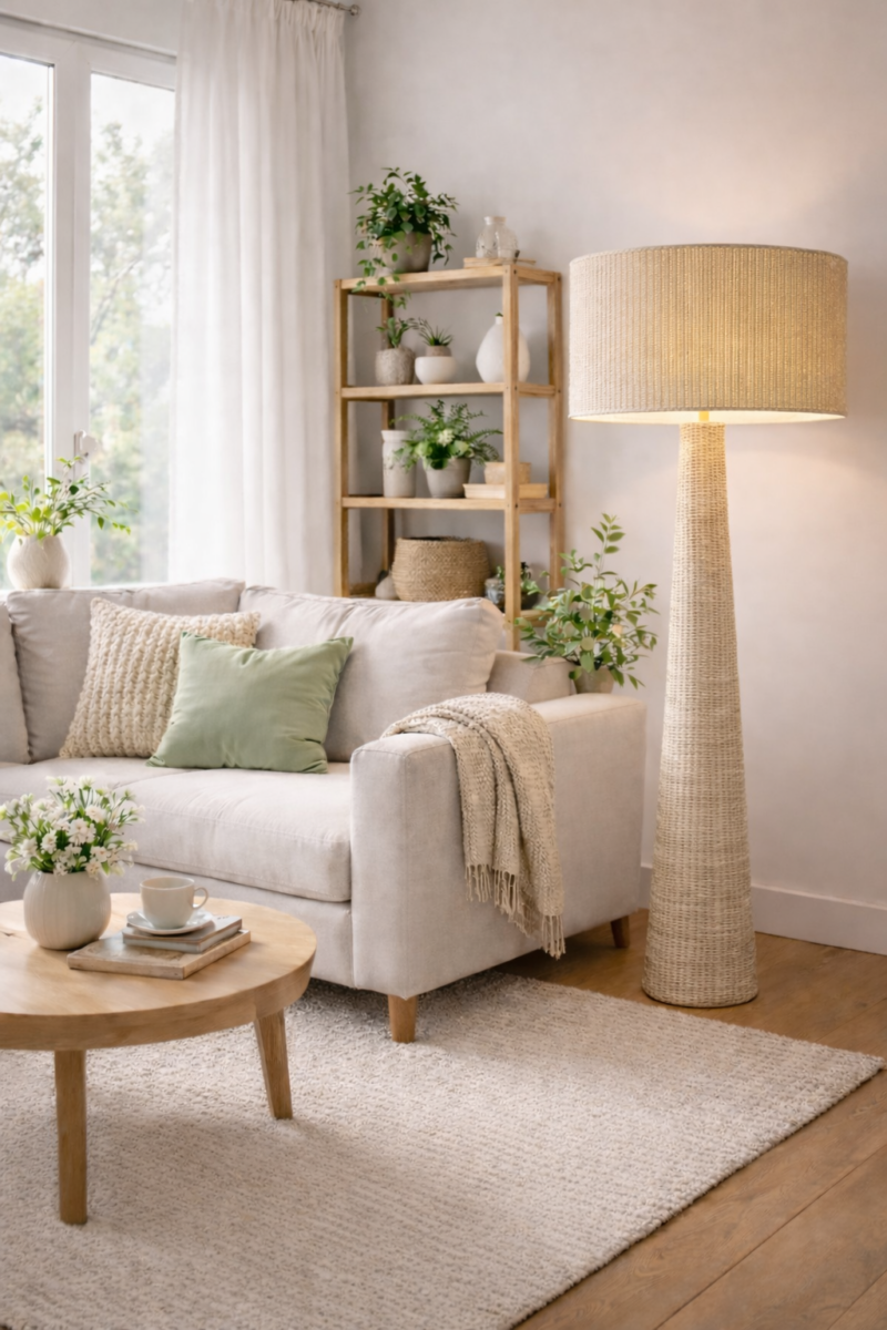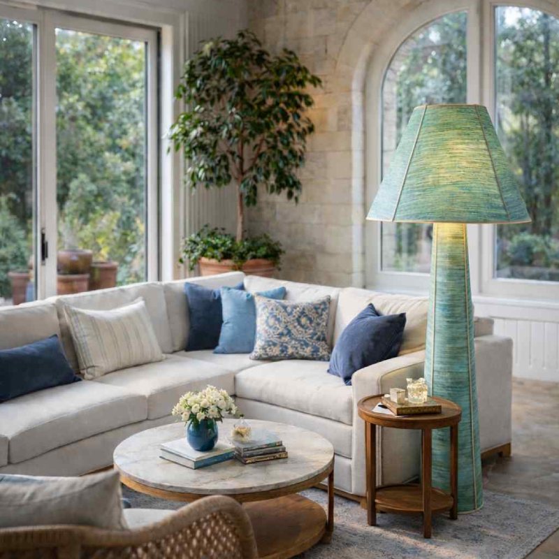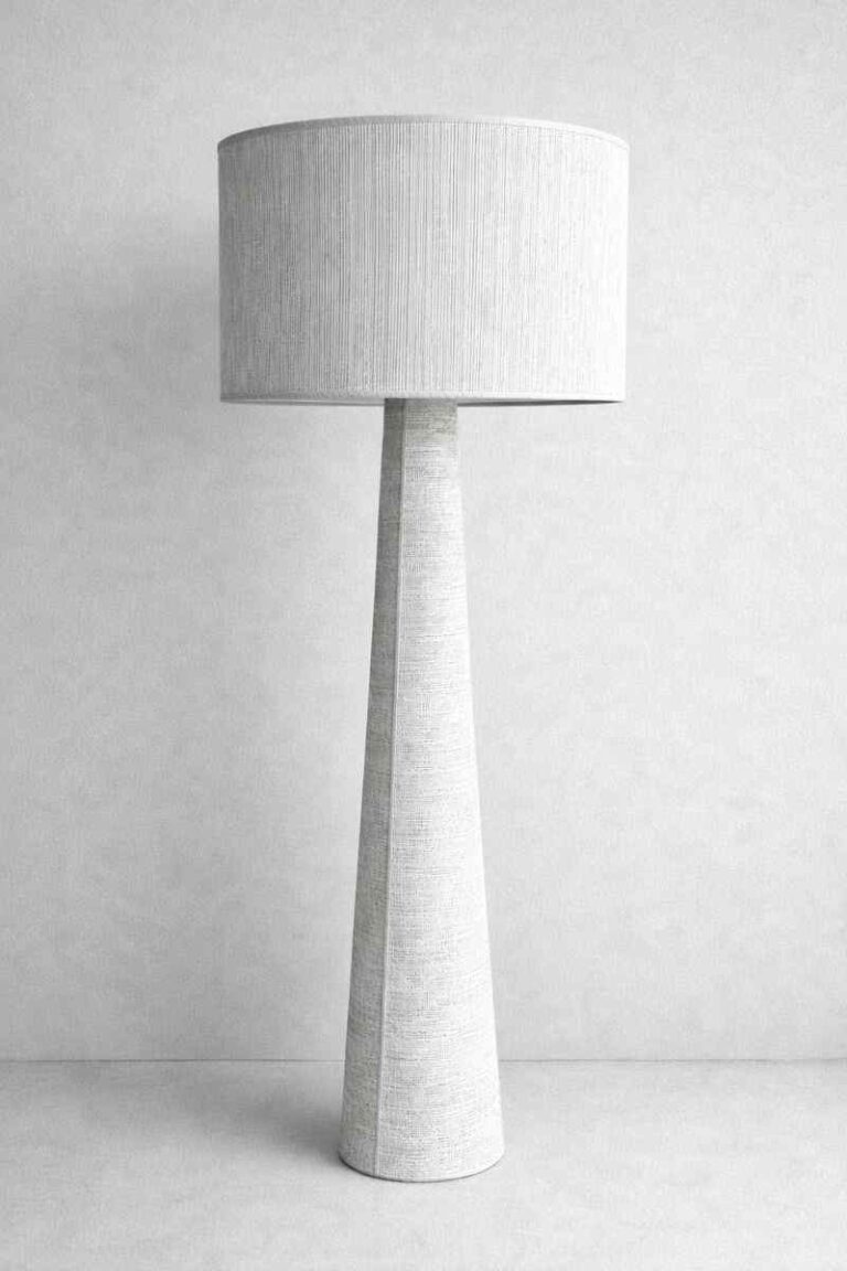 Lampa podłogowa wykonana ręcznie z naturalnego hiacyntu wodnego, z wysoką, smukłą podstawą i stożkowym lub cylindrycznym abażurem w barwionym odcieniu.