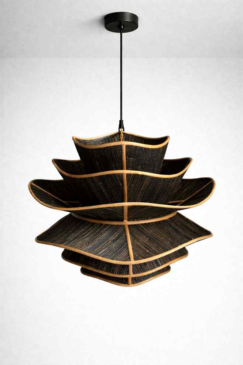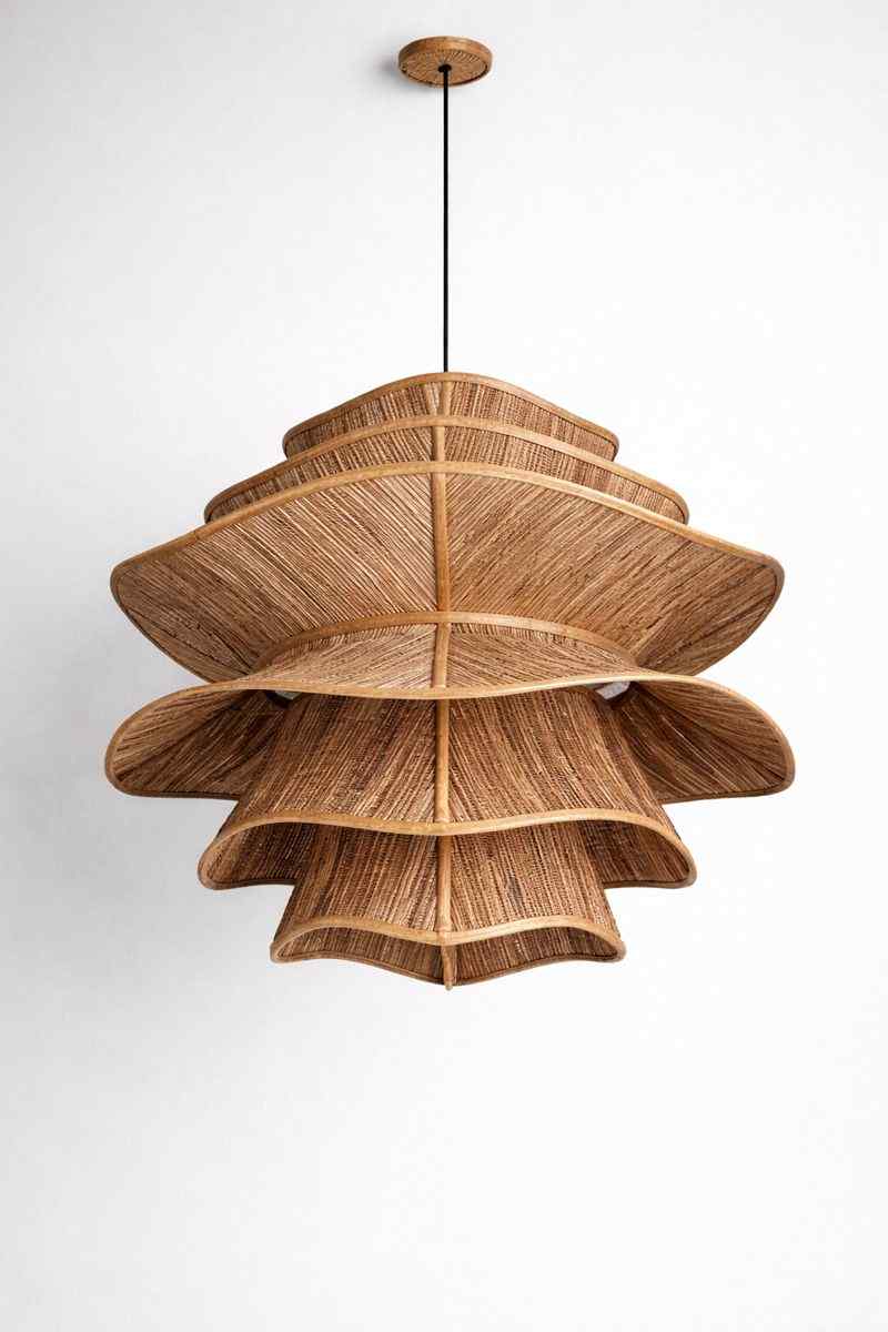 Lampa wisząca wykonana ręcznie z naturalnego hiacyntu wodnego, z wielowarstwowym, falistym kloszem o symetrycznej konstrukcji.