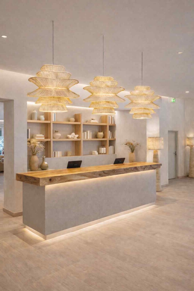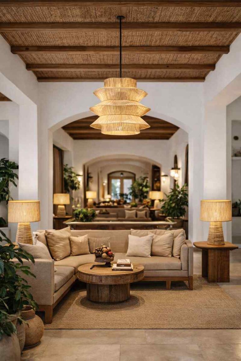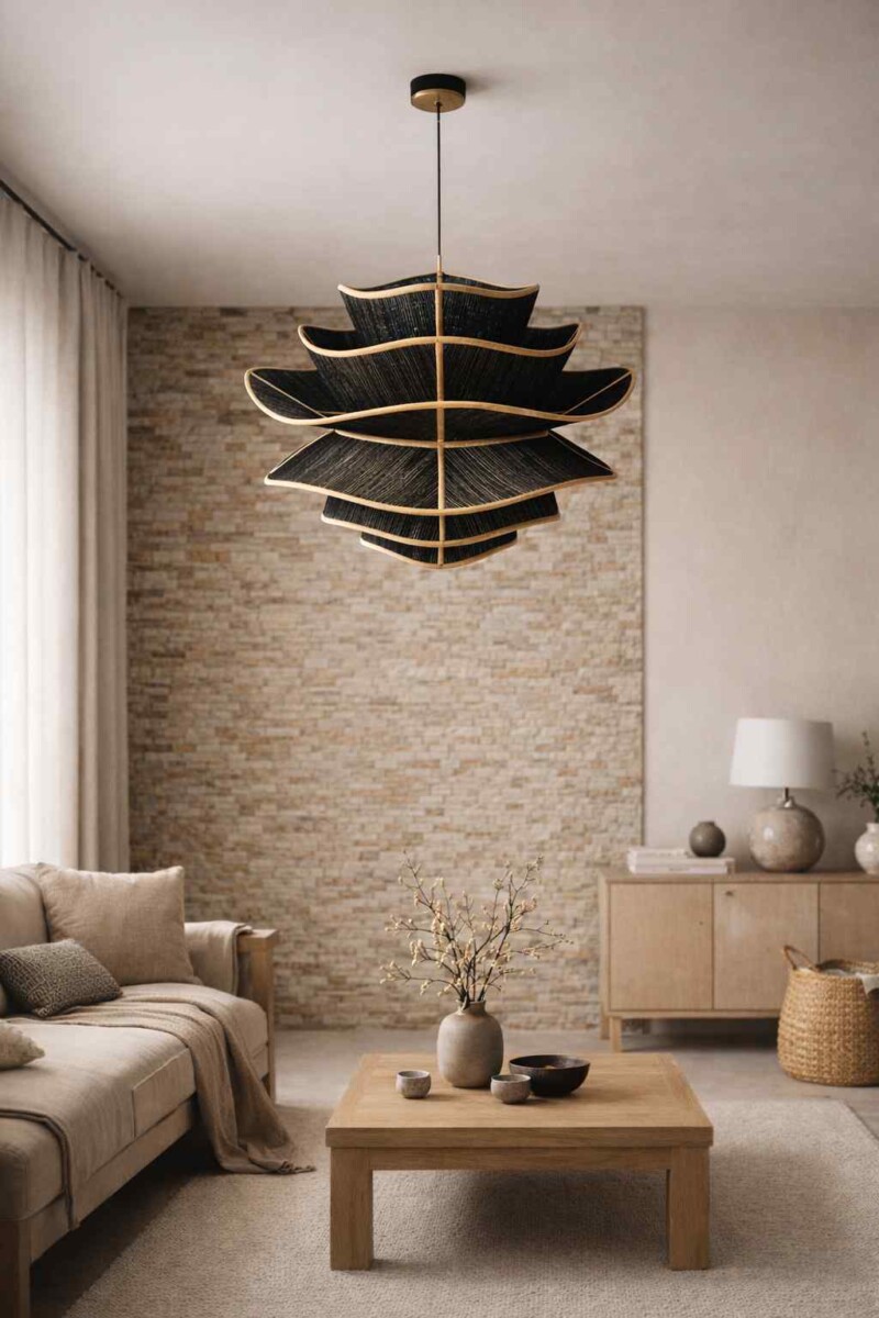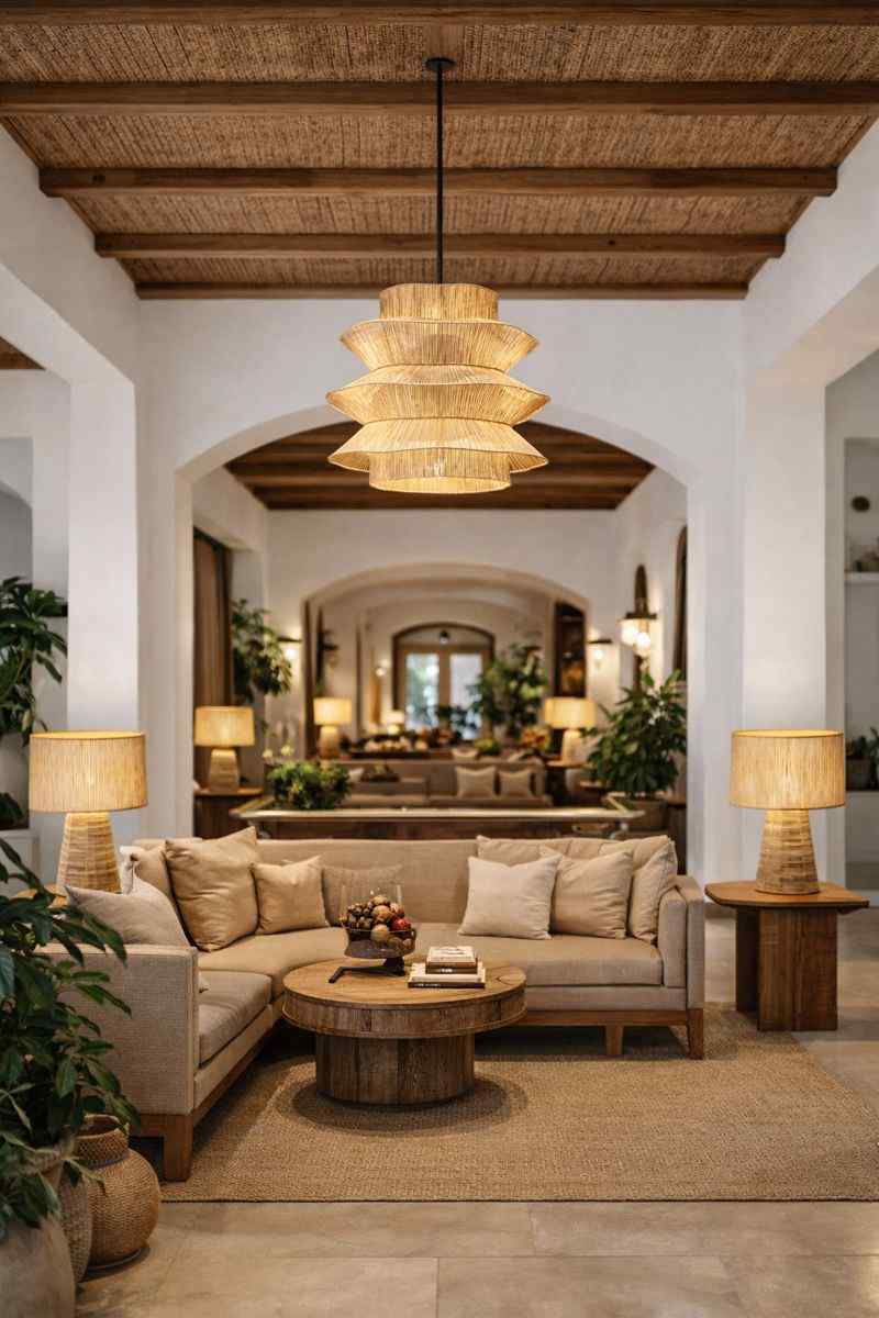 Naturalna plecionka zapewnia ciepłe, rozproszone światło, a lekka, ażurowa forma sprawia, że lampa idealnie sprawdzi się jako centralne oświetlenie dekoracyjne zarówno wewnątrz, jak i na zadaszonym tarasie.