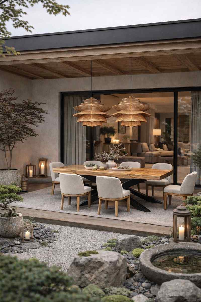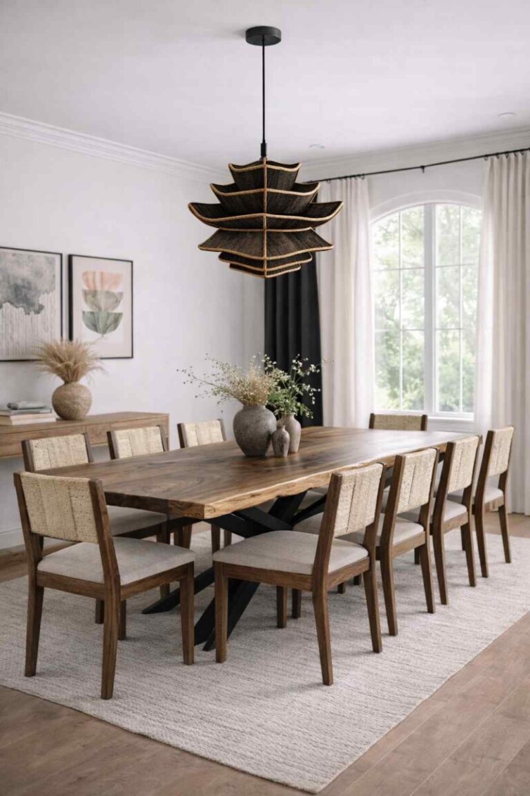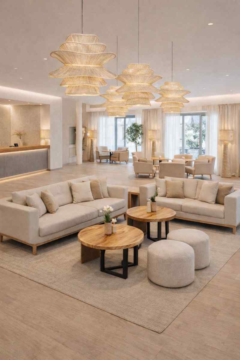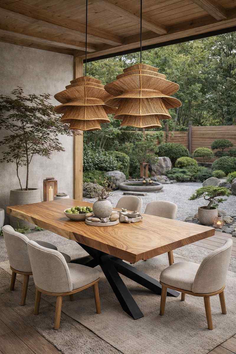 Naturalna plecionka zapewnia ciepłe, rozproszone światło, a lekka, ażurowa forma sprawia, że lampa idealnie sprawdzi się jako centralne oświetlenie dekoracyjne zarówno wewnątrz, jak i na zadaszonym tarasie.