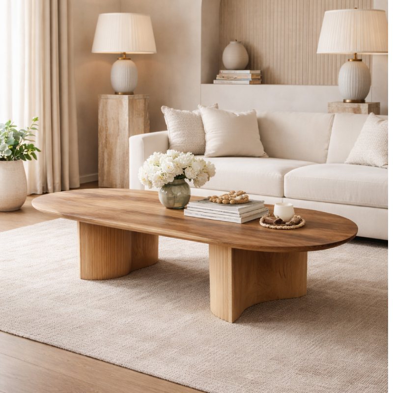 Jej styl to połączenie nowoczesnej elegancji, organicznych form i ponadczasowego designu, idealnie wpisującego się w wnętrza klasy premium, japandi, modern classic czy soft loft. Co więcej, montaż nóg jest w pełni dowolny — rzeźbienie może być skierowane na zewnątrz lub do wewnątrz, dzięki czemu ława może subtelnie zmieniać swój charakter i dopasować się do Twojej przestrzeni.